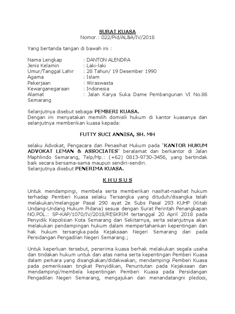 Mar 24, 2016 | informasi hukum | 4 comments.yang bertanda tangan di bawah ini. Contoh surat kuasa berikut ini dibuat sesuai dengan aturan yang ada. Contoh surat kuasa khusus pendampingan hukum. 33 rt.04 rw.17 kampung poncol bulak, jl.contoh surat permohonan tidak dilakukan penahanan; Kasus itu sekarang sedang ditangani oleh kuasa hukum hotman paris sebagai penasihat hukumnya.