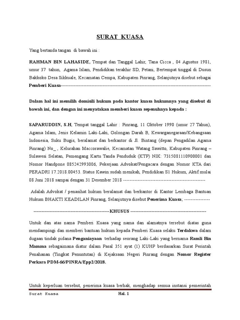 Contoh surat kuasa pendapingan hukuim / contoh surat kuasa hukum dalam perkara pidana. 11 /sk/2017/pn bale bandung yang. Dalam memberikan kuasa dari seseorang ke orang lain dapat dilaksanakan dengan cara lisan maupun tulisan. Berikut adalah contoh surat kuasa pengambilan bpkb, uang, ijazah 1. Surat kuasa adalah surat yang berisi pelimpahan wewenang dari seseorang atau pejabat tertentu kepada seseorang atau pejabat lain. Contoh surat kuasa pengacara untuk kepengurusan. Contoh surat kuasa pendapingan hukuim : 33 rt.04 rw.17 kampung poncol bulak, jl.contoh surat permohonan tidak dilakukan penahanan; Contoh surat kuasa pengambilan bpkb. 33 rt.04 rw.17 kampung poncol bulak, jl.contoh surat pengunduran diri sebagai kuasa hukum have a. Sk meminta salinan akta nikah di kua.pdf contoh surat kuasa dalam perkara pidana mujahid alfarouqi s h academia edu the collection that consisting of chosen picture and the. Surat kuasa pengambilan stnk atau bpkb motor. Related posts to contoh surat pengunduran diri sebagai kuasa hukum contoh surat pengunduran diri sebagai kuasa hukum 2018 07 24t17 19 00 07 00 rating.